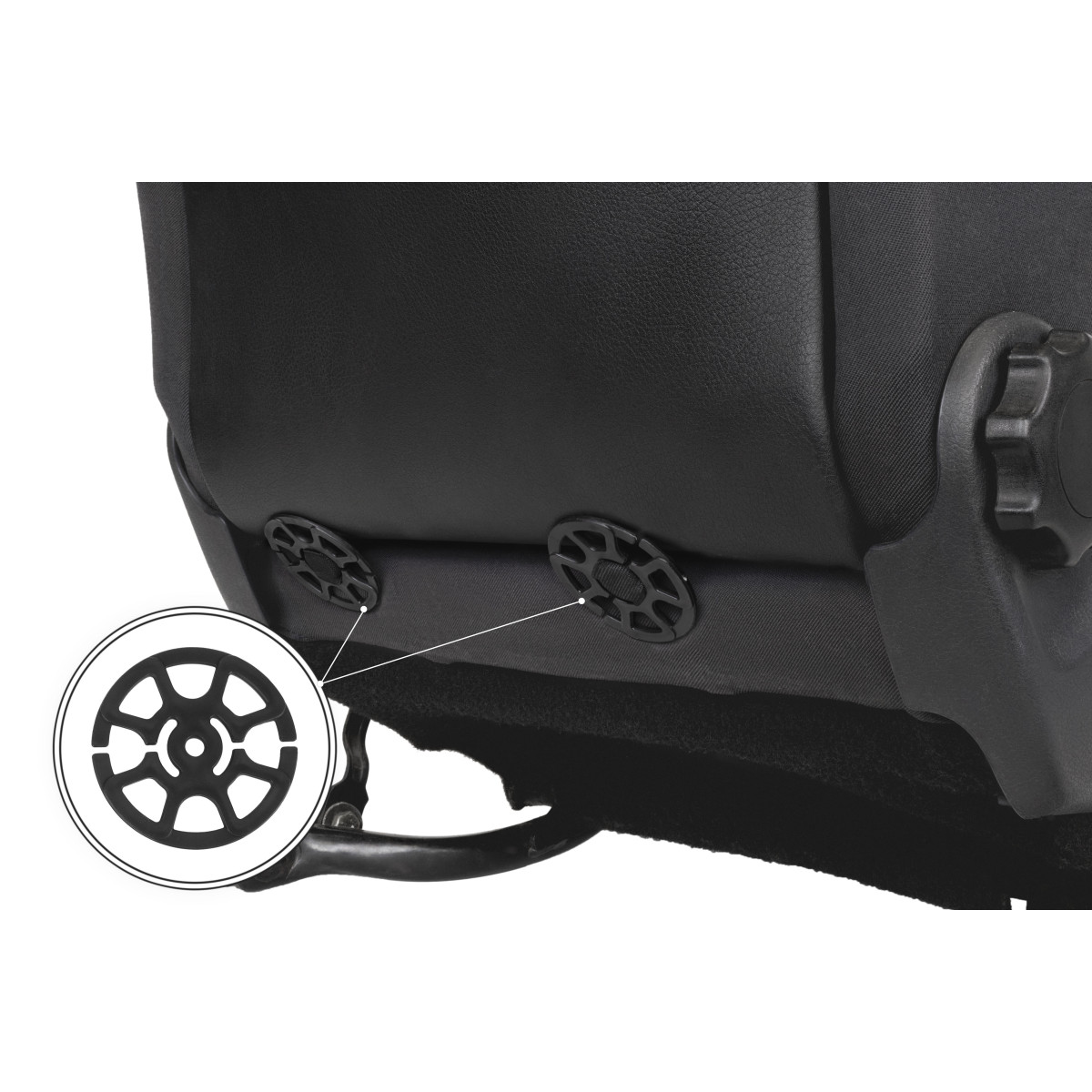 - Priekšējie pārvalki tiek piestiprināti zem sēdekļa un aizmugurē ar plastmasas gredzenu klipšiem starp sēdekļa pamatu un atzveltni